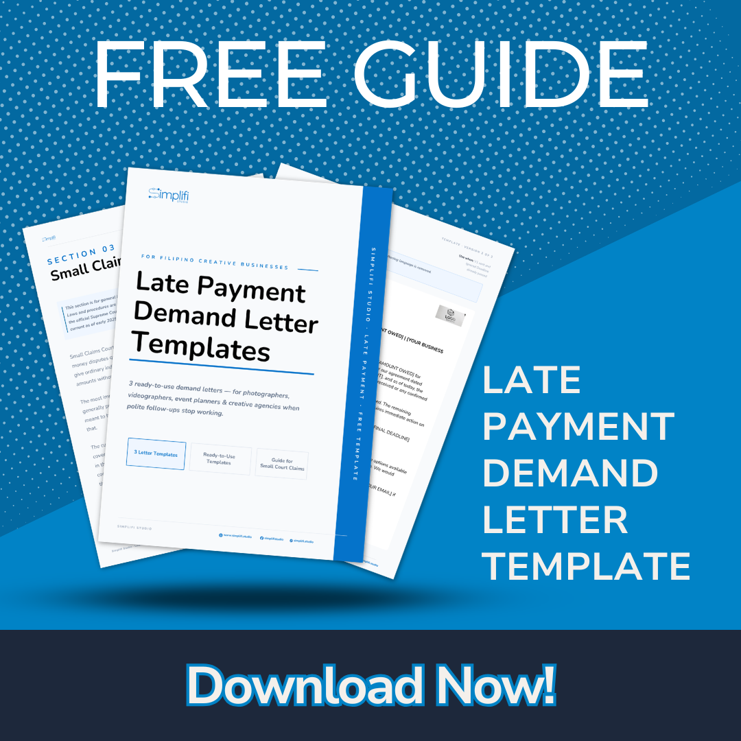 We understand that late payments are a common challenge for Filipino creatives. That’s why we created a Late Payment Demand Letter Template Pack. It includes three templates: a polite-firm first notice, a direct second notice, and a final demand letter with legal grounding for more serious cases.